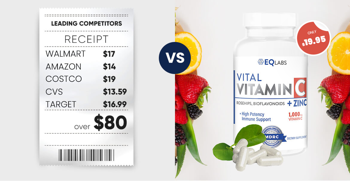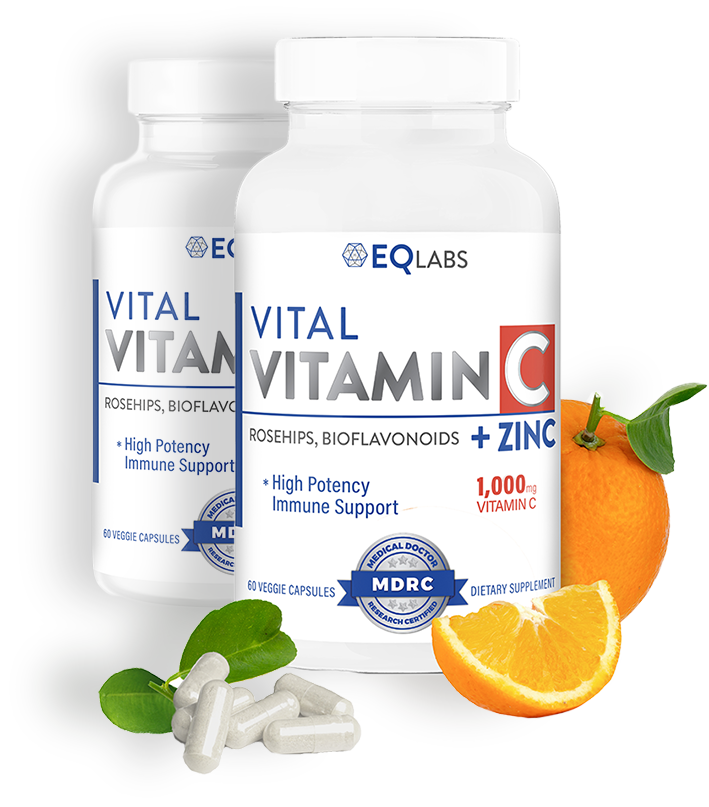 VITAMIN C is VITAL for OUR IMMUNE SYSTEM - It is a highly efficient antioxidant and EQ LABS created a unique immune system booster blend of Vitamin C, Zinc, Rose Hips and Bioflavonoids that has Beneficial effects of vitamin C supplementation and have been reported for acute respiratory infections, reducing the severity and duration of the common cold, preventing the incidence of pneumonia in people who are vitamin C deficient.